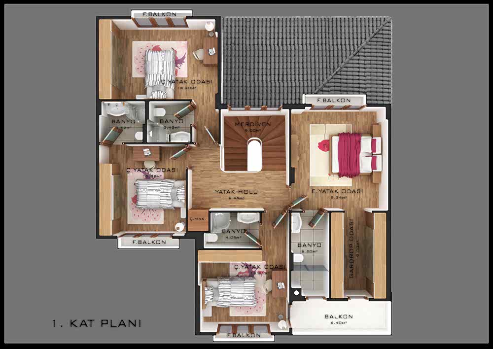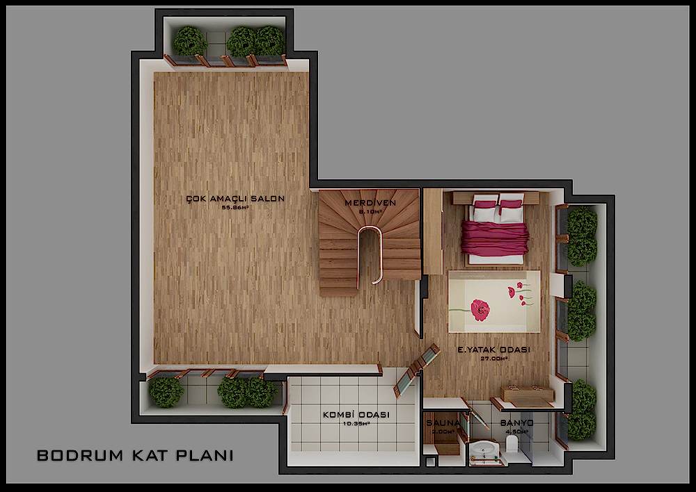 Modern iç ve dış mimarisi ve de isteğe bağlı olarak planlanacak bahçe tanzimi ile size özel bir proje olacaktır. 125 m2 Bodrum, 170 m2 Zemin, 145 m2 1. Kat olmak üzere, Toplam 440 m2 kapalı inşaat alanı vardır.